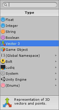 In modern scripting, everything is an Object: numbers, pieces of text, vectors and Unity components are all objects. To differentiate what they represent and what they can do, each object has a Type. In Bolt, most types are represented with an icon.