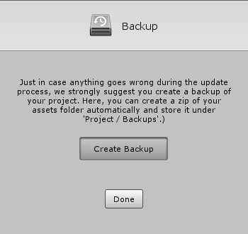 Note: We recommend using a version control system (VCS) such as Unity Collaborate, Git or Subversion instead of this rudimentary backup utility.