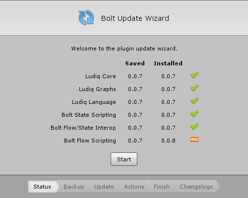 Once a new version has been downloaded and imported from the asset store, the update wizard should automatically open. If not, you can open it manually via Tools > Bolt > Update Wizard….