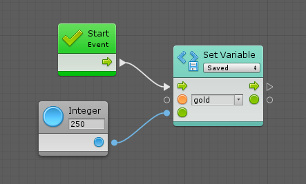 Setting the value of a variable that doesn’t exist automatically creates it. For example, this graph would create a new saved integer variable named gold with a value of 250, even if we hadn’t defined it before: