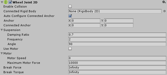 used with 3D physics, the Wheel Joint 2D uses a separate Rigidbody object for the wheel, which rotates when the force is applied. (The Wheel Collider, by contrast, simulates the suspension using a raycast and the wheel’s rotation is purely a graphical effect). The wheel object will typically be a Circle Collider 2D with a Physics Material 2DUse to adjust the friction and bounce that occurs between 2D physics objects when they collide More info