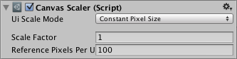 Using the Constant Pixel Size mode, positions and sizes of UI elements are specified in pixels on the screen. This is also the default functionality of the Canvas when no Canvas Scaler is attached. However, With the Scale Factor setting in the Canvas Scaler, a constant scaling can be applied to all UI elements in the Canvas.