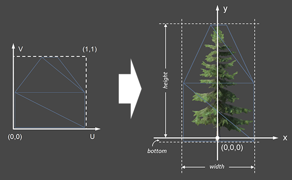 All vertices are considered in UV-space (see Fig. 1 below), because the geometry is due to be textured by the billboard images. UV vertices are easily expanded to 3D-space vertices by knowing the billboard's width, height, bottom, and what direction the billboard is currently facing. Assuming we have a billboard located at (0,0,0) looking at negative Z axis, the 3D-space coordinates are calculated as: