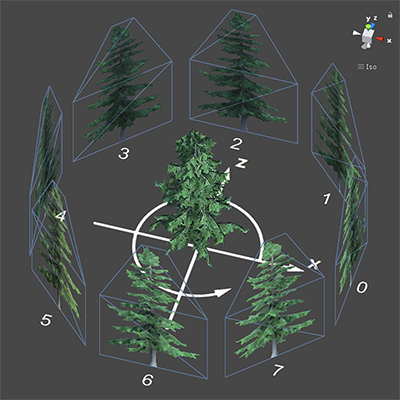 In order to display something similar to the real 3D mesh being billboarded, SpeedTree billboards select an appropriate image from several pre-rendered images according to the current view direction. The images in Figure 2 below are created by capturing the rendered image of the 3D tree at different view angles, evenly distributed around the Y-axis. The first image always starts at positive X axis direction (or 0° if you imagine a unit circle from above).