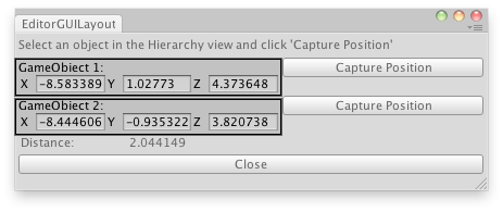 EditorGUILayout.BeginHorizontal(); obj2 = EditorGUILayout.Vector3Field("GameObject 2:", obj2); if (GUILayout.Button("Capture Position")) obj2 = Selection.activeTransform.position; EditorGUILayout.EndHorizontal(); EditorGUILayout.LabelField("Distance:", distance.ToString()); if (GUILayout.Button("Close")) this.Close(); }
