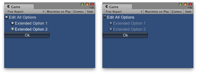 // These two controls will only be enabled if the button above is on. extended1 = GUI.Toggle(new Rect(20, 20, 130, 20), extended1, "Extended Option 1"); extended2 = GUI.Toggle(new Rect(20, 40, 130, 20), extended2, "Extended Option 2");