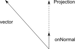 To understand vector projection, imagine that onNormal is resting on a line pointing in its direction. Somewhere along that line will be the nearest point to the tip of vector. The projection is just onNormal rescaled so that it reaches that point on the line.