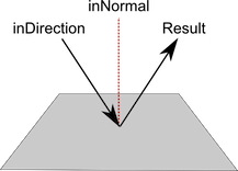 The inNormal vector defines a plane (a plane's normal is the vector that is perpendicular to its surface). the inDirection vector is treated as a directional arrow coming in to the plane. The returned value is a vector of equal magnitude to inDirection but with its direction reflected.
