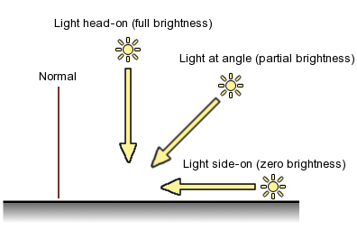 The triangles are enough to define the basic shape of the object but extra information is needed to display the mesh in most cases. To allow the object to be shaded correctly for lighting, a normal vector must be supplied for each vertex. A normal is a vector that points outward, perpendicular to the mesh surface at the position of the vertex it is associated with. During the shading calculation, each vertex normal is compared with the direction of the incoming light, which is also a vector. If the two vectors are perfectly aligned, then the surface is receiving light head-on at that point and the full brightness of the light will be used for shading. A light coming exactly side-on to the normal vector will give no illumination to the surface at that position. Typically, the light will arrive at an angle to the normal and so the shading will be somewhere in between full brightness and complete darkness, depending on the angle.