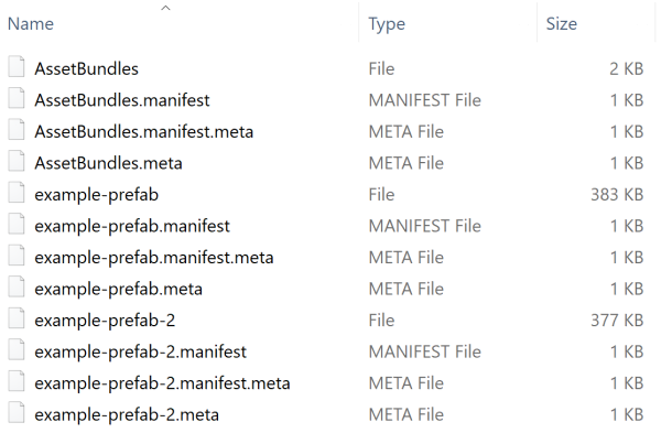 Now if you rebuild the AssetBundles, the generated output includes a separate modulesmaterials AssetBundle (359 KB), which contains the Material and its associated Texture. This significantly reduces the size of the other AssetBundles for the Prefabs (from roughly 380 KB in the previous iteration down to roughly 20 KB).