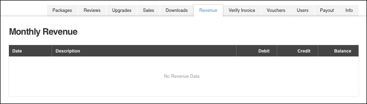 The Sales tab displays the sales data on each of your paid packages (one row for each package). It also displays the Gross and Net amounts for the selected month. You can view the sales figures for different months by changing the month from the drop down box.