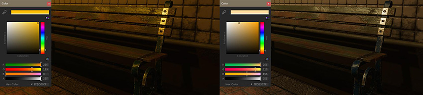 When choosing the right color for your lights, consider the effect of the color and value chosen. When selecting color, try not to completely leave out any one of the color channels completely. This creates a light that is difficult to converge with the white point. For example, although it is technically a valid light color, the light color on the left image below removes all blue color from the final output: