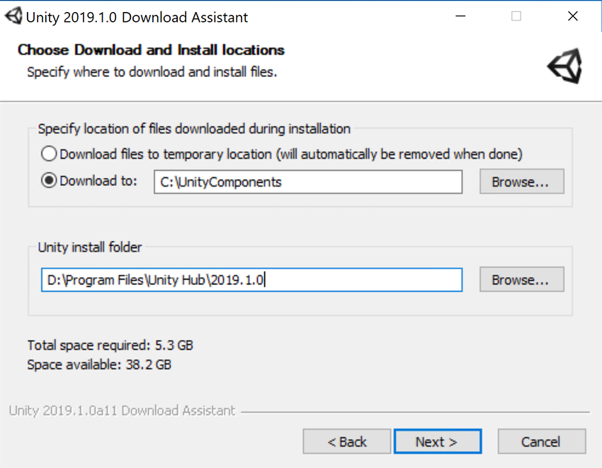 Run the Download Assistant, and install Unity as normal on one computer. This computer must have enough free disk space to download all the files. Click the dropdown and select Custom, then choose the location you wish to download the files to.