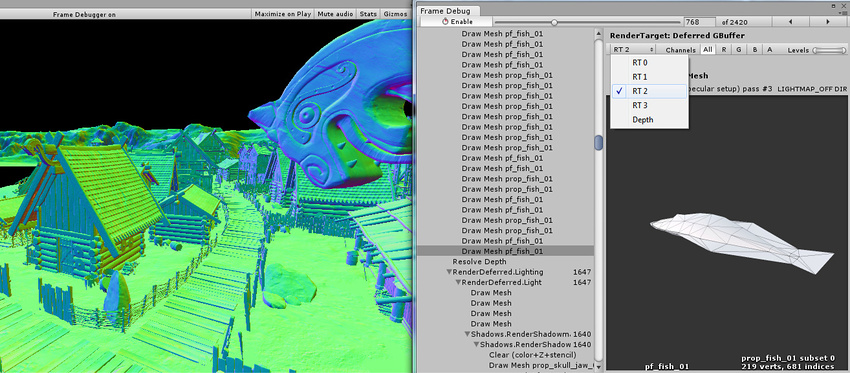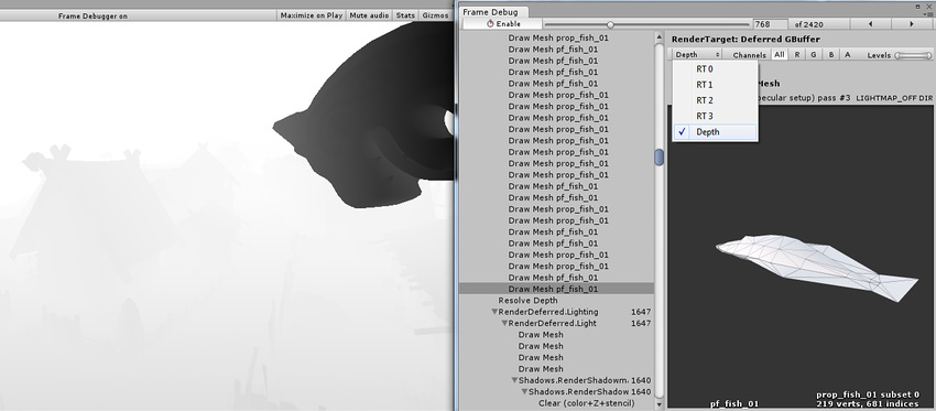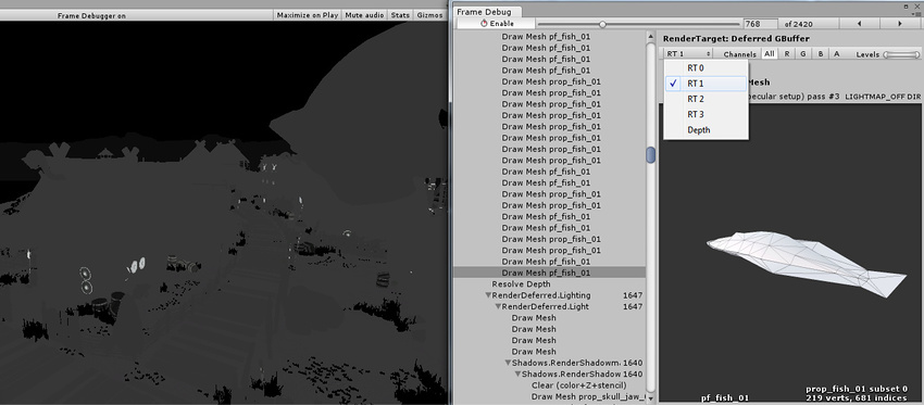 If rendering happens into a RenderTexture at the selected draw call, then contents of that RenderTexture are displayed in the Game view. This is useful for inspecting how various off-screen render targets are built up, for example diffuse g-buffer in deferred shadingA rendering path in the Built-in Render Pipeline that places no limit on the number of Lights that can affect a GameObject. All Lights are evaluated per-pixel, which means that they all interact correctly with normal maps and so on. Additionally, all Lights can have cookies and shadows. More info