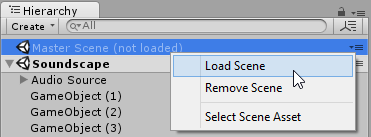 When you have multiple scenes open in the editor, each scene’s contents are displayed separately in the hierarchy window. Each scene’s contents appears below a scene divider bar which shows the scene’s name and its save state.