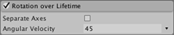 | Curve | The angular velocity can be set to change over the lifetime of the particle. A curve editor appears at the bottom of the InspectorA Unity window that displays information about the currently selected GameObject, asset or project settings, allowing you to inspect and edit the values. More info See in Glossary which allows you to control how the velocity changes throughout the lifetime of the particle (see Image A below). If the Separate Axes box is ticked, each of the X, Y and Z axes can be given curved velocity values. |