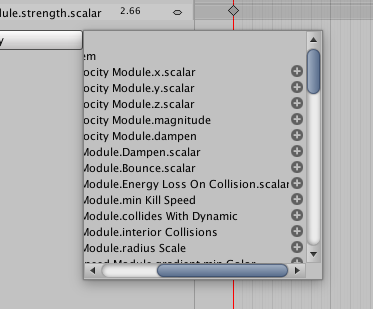 Note that for curves, you can only keyframe the overall curve multiplier, which can be found next to the curve editor in the InspectorA Unity window that displays information about the currently selected GameObject, asset or project settings, allowing you to inspect and edit the values. More info