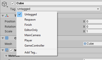 The Inspector shows the Tag and Layer drop-down menus just below any GameObject’s name. To apply an existing Tag to a GameObject, open the Tags dropdown and choose the Tag you want to apply. The GameObject is now associated with this Tag.