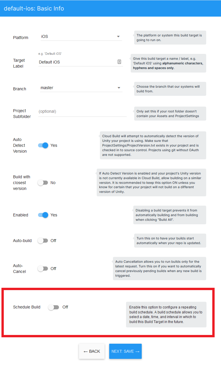 lets you configure build targets to automatically build on a schedule. To start setting up a schedule, enable the Schedule Build option on the Basic Info page for your build target.