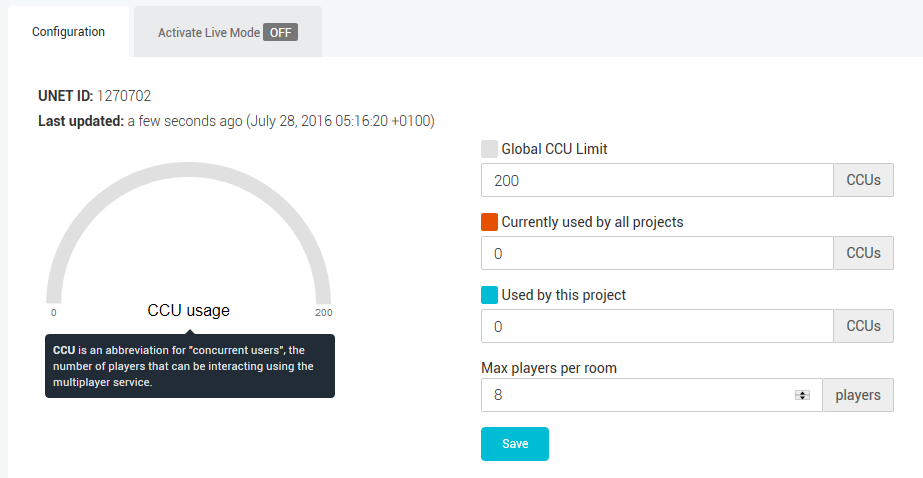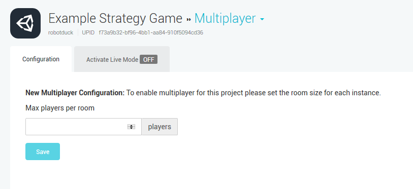 If you haven’t set up your project with the Multiplayer service yet, you are prompted to set up a New Multiplayer Configuration. To do this, enter the number of players you want per room and click Save.
