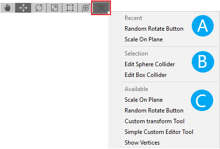 To activate custom Editor tools, right-click the Available Custom Editor Tools button in the Scene view toolbarA row of buttons and basic controls at the top of the Unity Editor that allows you to interact with the Editor in various ways (e.g. scaling, translation). More info