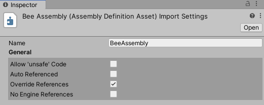 | Override References | Enable the Override References setting to manually specify which precompiled assemblies this assembly depends upon. When you enable Override References, the Inspector shows the Assembly References section, which you can use to specify the references. A precompiled assembly is a library compiled outside your Unity Project. By default, assemblies you define in your Project reference all the precompiled assemblies you add to the Project, which matches how the predefined assemblies reference all precompiled assemblies. When you enable Override References, this assembly only references the precompiled assemblies you add under Assembly References. Note: To prevent Project assemblies from automatically referencing a precompiled assembly, you can disable its Auto Referenced option. See Plugin Inspector for more information. |