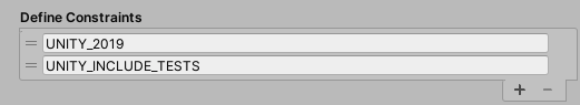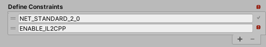 Unity marks each constraint with an indicator based on the currently defined settings. For example, the following set of two constraints indicates that one symbol is currently defined while the other is not. Since each individual constraint must be true for the overall constraint to be satisfied, the Define Constraints box is also marked as invalid or incompatible.