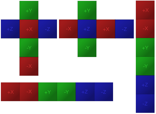 Vertical and horizontal cross layouts, as well as column and row of cubemap faces are supported: