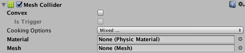 | Cooking Options | Enable or disable the Mesh cooking options that affect how the physics engine processes Meshes. | |