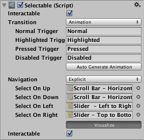 | Navigation | The Navigation options refers to how the navigation of UI(User Interface) Allows a user to interact with your application. More info See in Glossary elements in play mode will be controlled. |