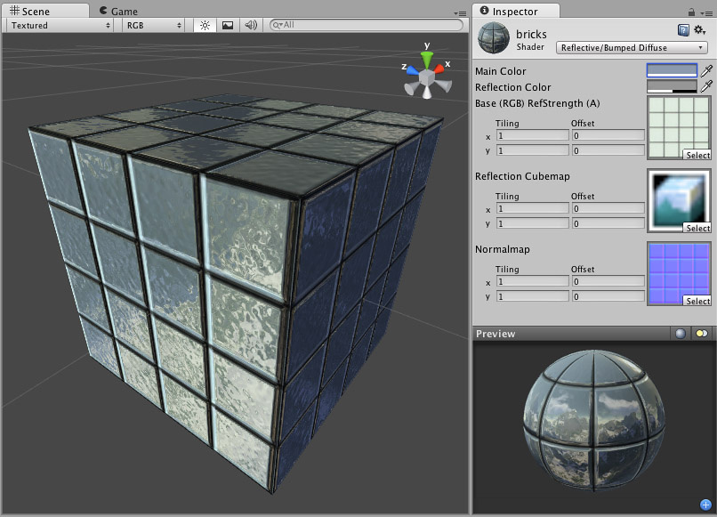See in Glossary which will define what exactly is reflected. The main texture’s alpha channel defines the strength of reflection on the object’s surface. Any sceneA Scene contains the environments and menus of your game. Think of each unique Scene file as a unique level. In each Scene, you place your environments, obstacles, and decorations, essentially designing and building your game in pieces. More info
