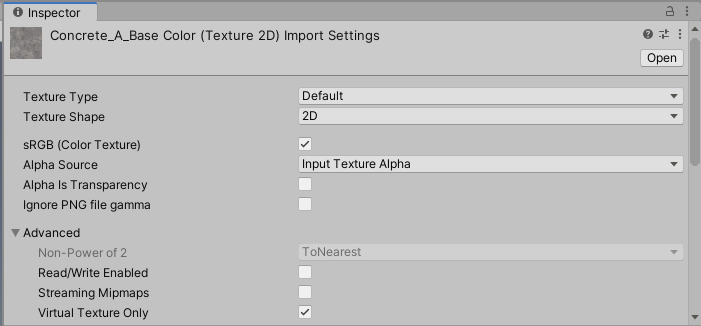 loading times, and reduces the size of the build. To mark a texture as one that only Virtual Texturing uses, open its Texture Importer and enable Virtual Texture Only.