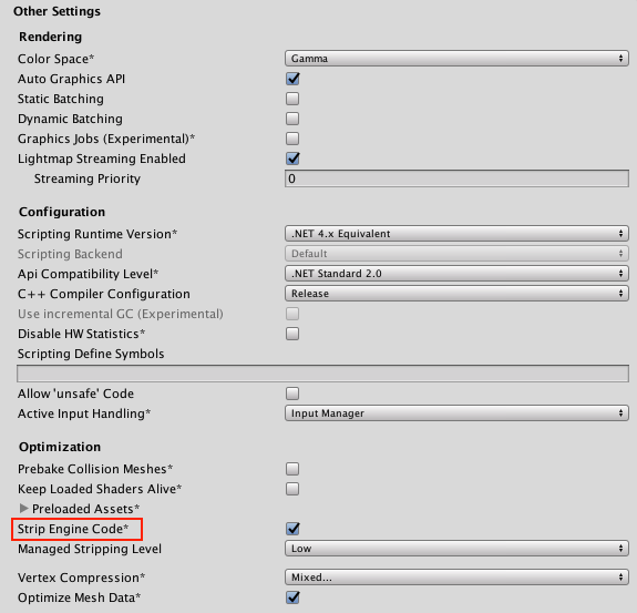 Note that the Strip Engine Code option only affects Unity engine code. IL2CPPA Unity-developed scripting back-end which you can use as an alternative to Mono when building projects for some platforms. More info