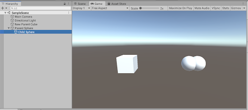 Notice how the Child Sphere is in the same position but now relative to the New Parent Cube.